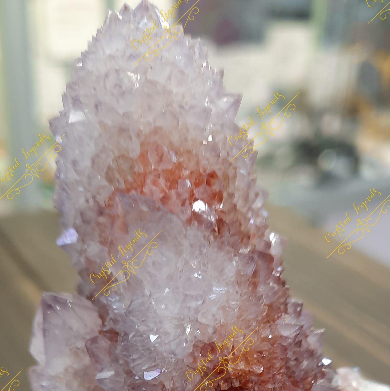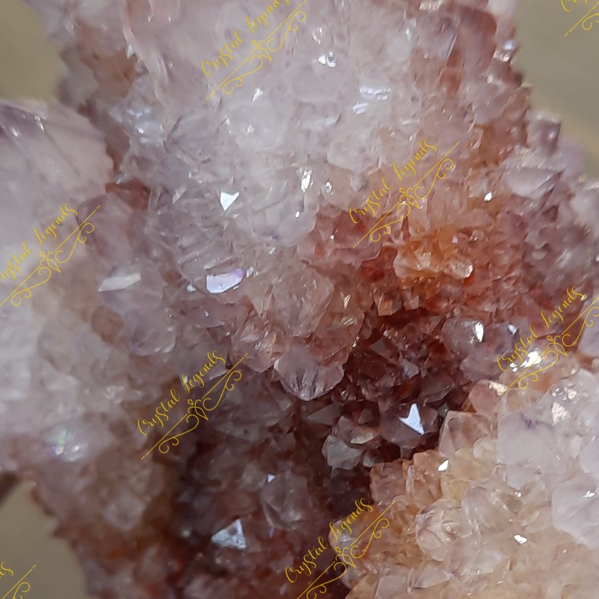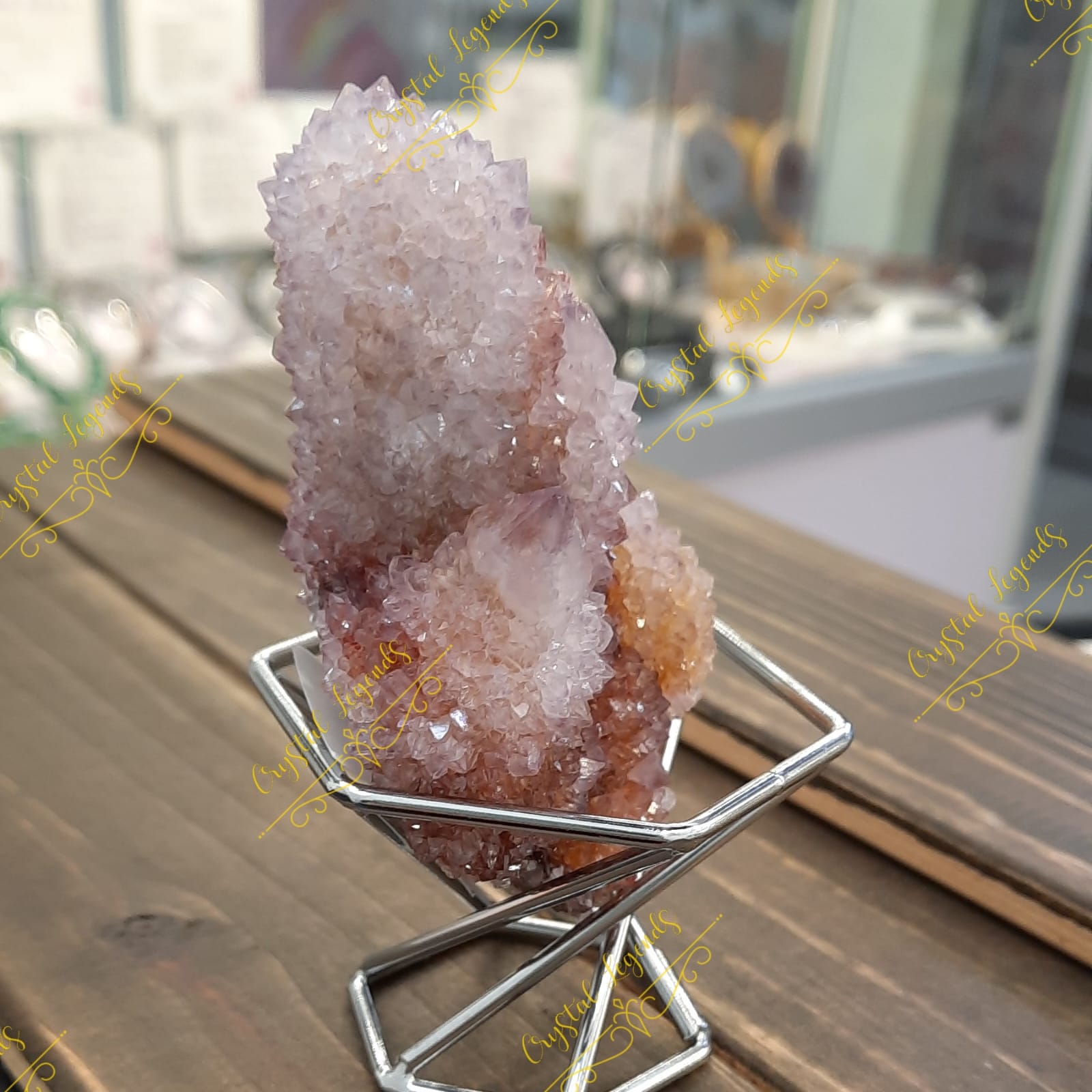 這是産自南非仙人掌紫晶簇,淡淡的紫色,較深的泥黃色,晶牙很小,但非常閃亮,每個外形獨特,找不對相同,是礦物愛酷者必收礦石。