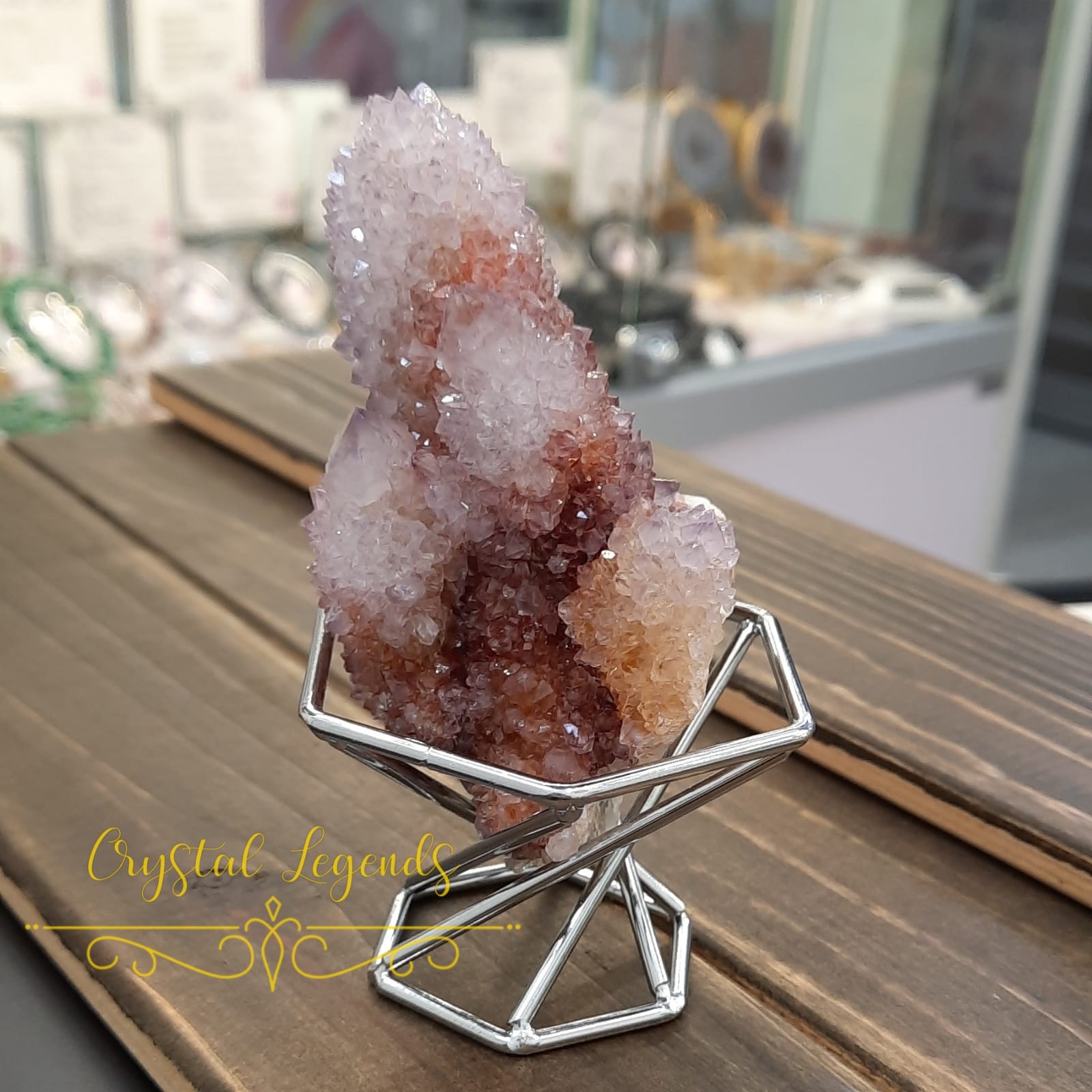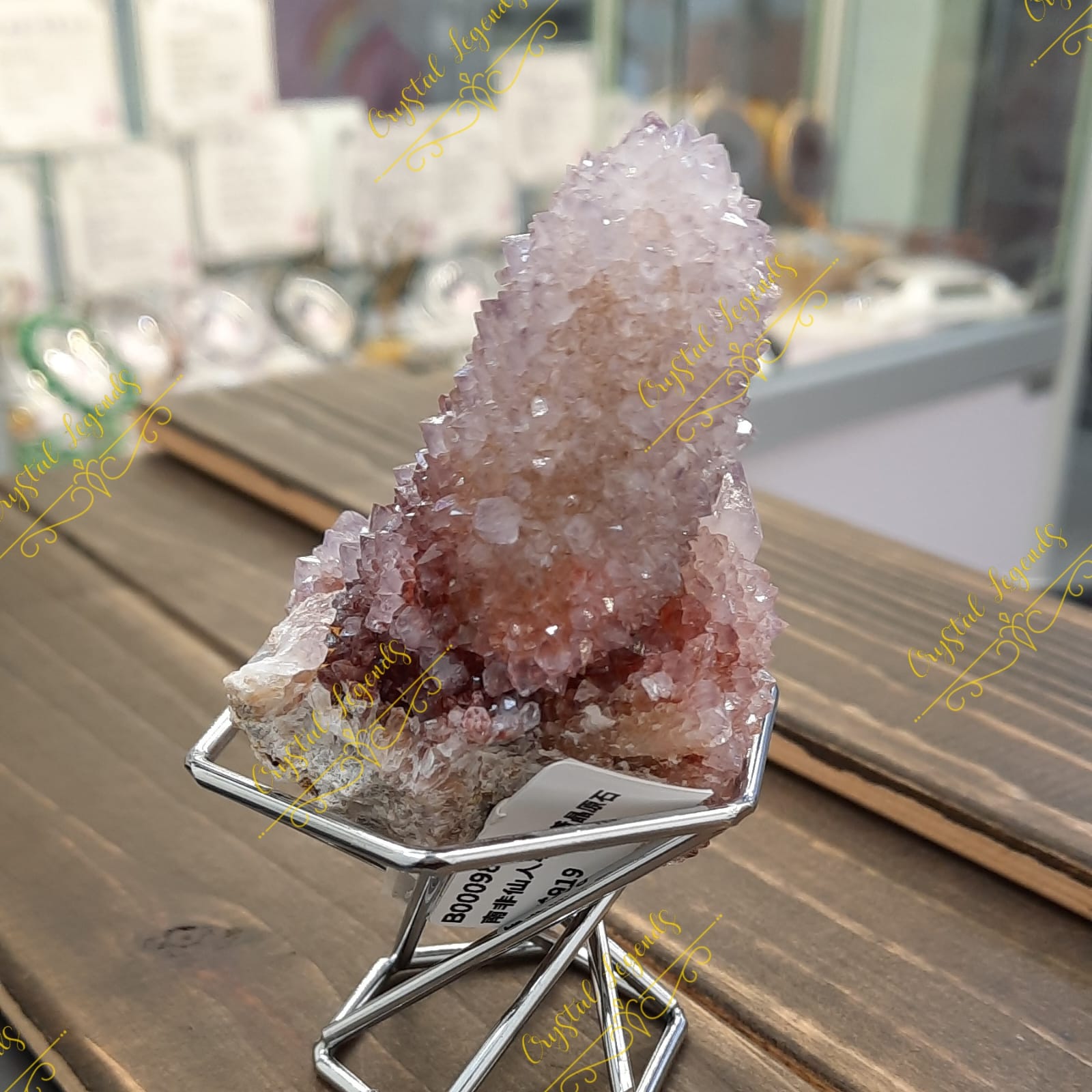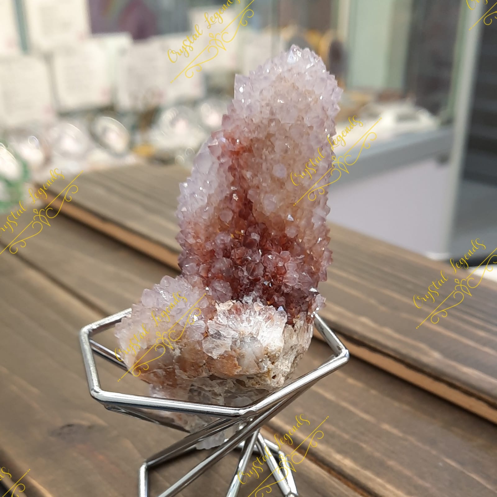 這是産自南非仙人掌紫晶簇,淡淡的紫色,較深的泥黃色,晶牙很小,但非常閃亮,每個外形獨特,找不對相同,是礦物愛酷者必收礦石。